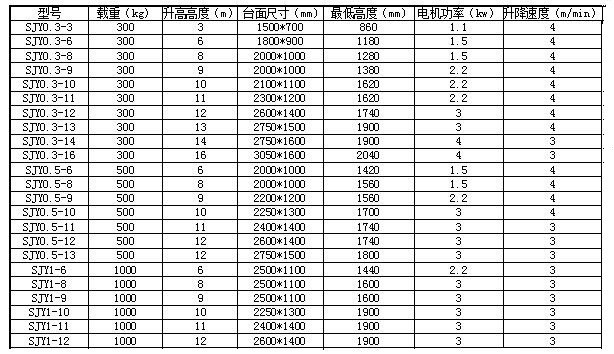 根據升降機高度分為4、6、8、10、12、14、16、18米.....,載重分為:300、500公斤、1000公斤和2000公斤不等其它載重量可以訂制加工。